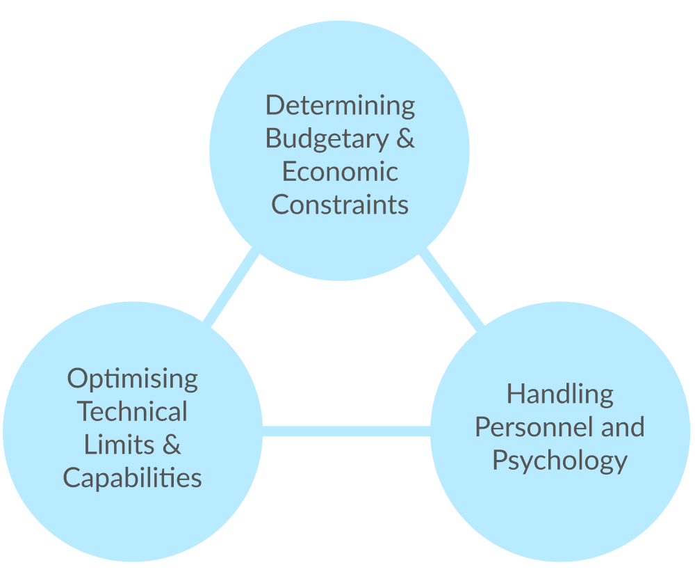 We take a top-down approach to leveraging tangible economic result in your organisation. From the highest viewpoint down, we dive down to the workplace, analyzing every step of the process. Along the way, we consider risks, guiding measures and the organisation at large that they play out in. According to our philosophy advanced technical project management concerns the balance between the three major points shown below.